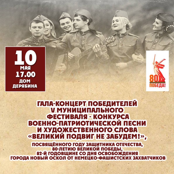10 мая в Доме Дерябина состоится гала-концерт победителей V муниципального фестиваля-конкурса военно-патриотической песни и художественного слова «Великий Подвиг не забудем!», посвящённого 80-летию Великой Победы и 82-летию со дня освобождения города Новый Оскол от немецко-фашистских захватчиков.