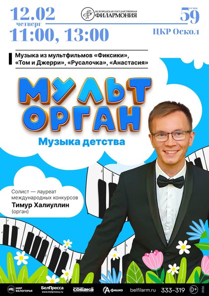 В концерте «МультОрган» Тимур Халиуллин представит удивительную программу, которая подарит детям и взрослым новое прочтение знакомых с детства мелодий. Начало в 11.00 и 13.00. Цена билета: 250 рублей.
